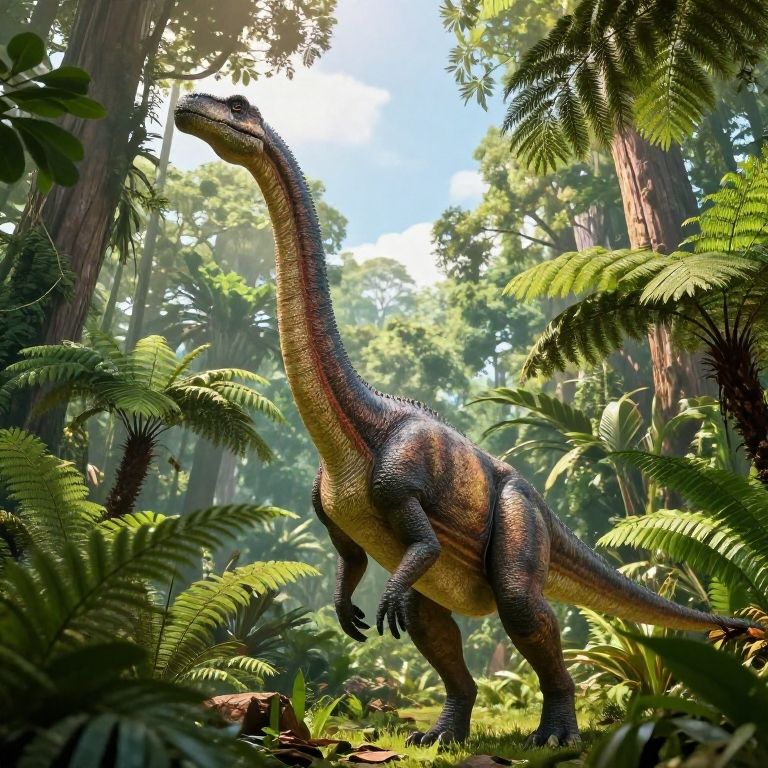 Dinosaur by tranquil riverbank amid ferns and cycads, reflecting in water, brighly colored prehistoric flowers around, soft morning light, hyper-detailed natural environment, impressive dinosaur anatomy in a peaceful setting