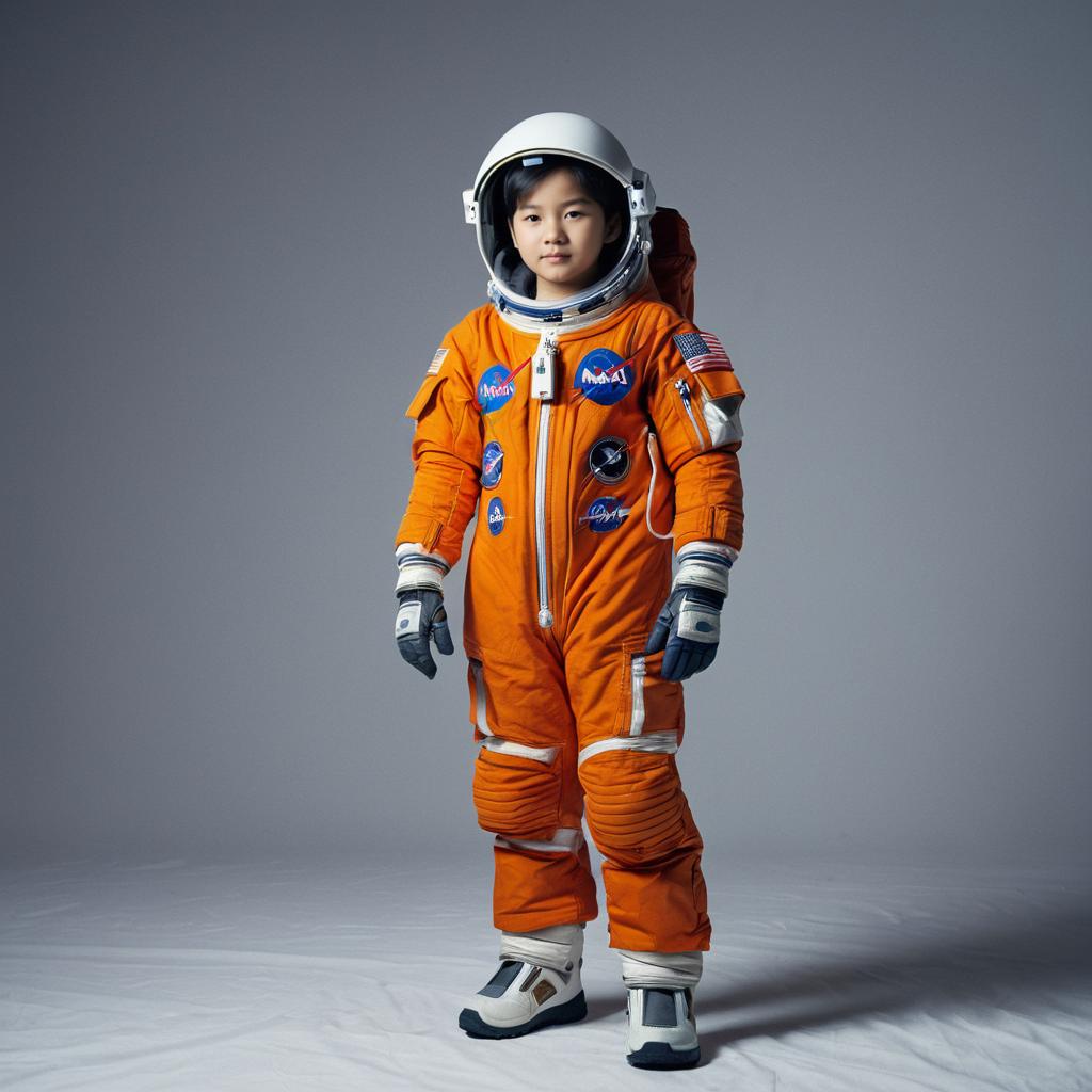 Orange nasa jumpsuit,solo, 1boy, realistic, male focus, gloves, standing, spacesuit, full body, asian, astronaut, looking at viewer
