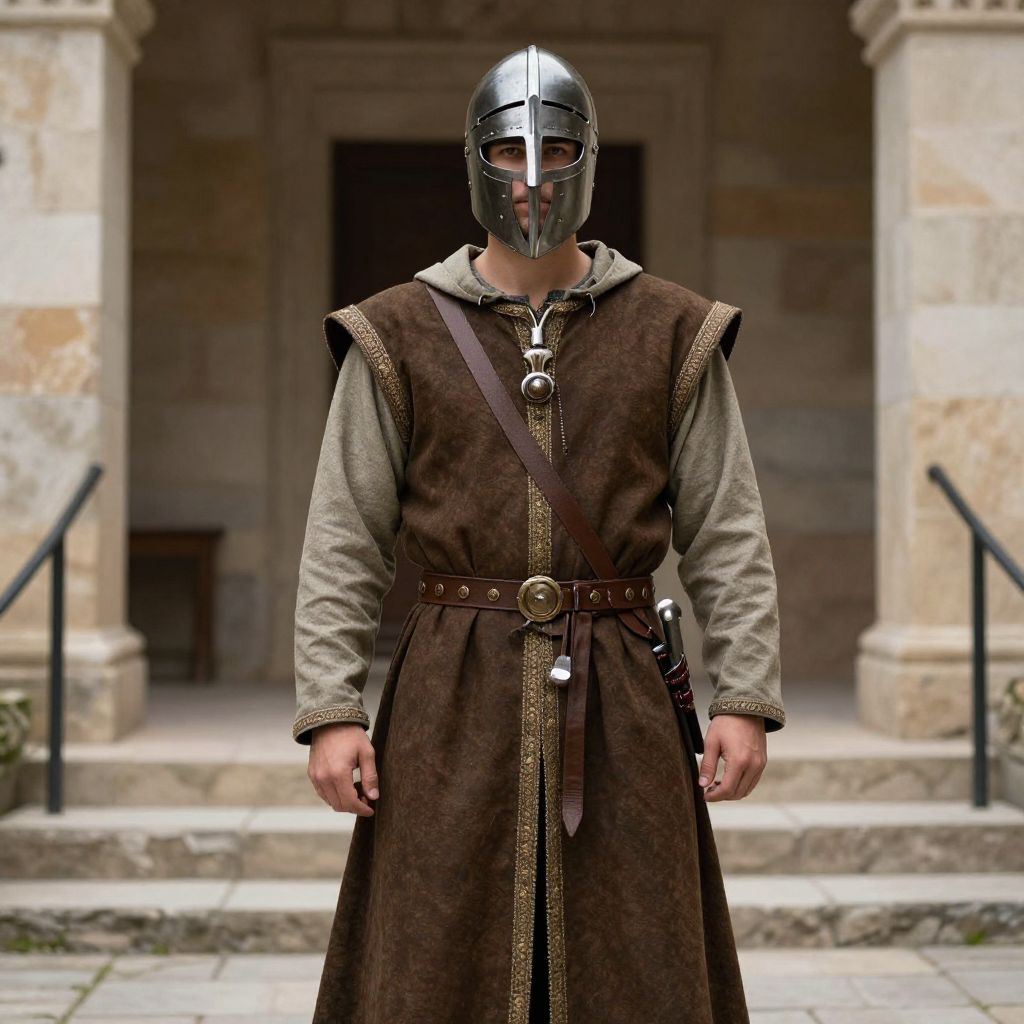 "Sca Byzantine Garb, man in a medieval costume with a sword and a helmet"