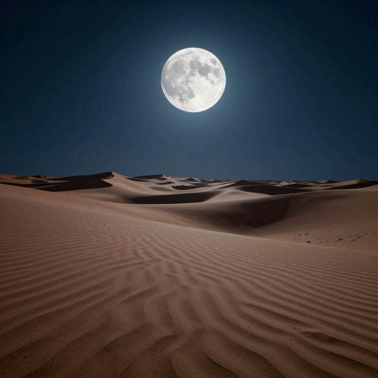 A vast desert under a surreal night sky, where a luminous, textured moon looms impossibly close, casting ethereal light across rippling sand dunes that seem to ripple like liquid under its gaze.
