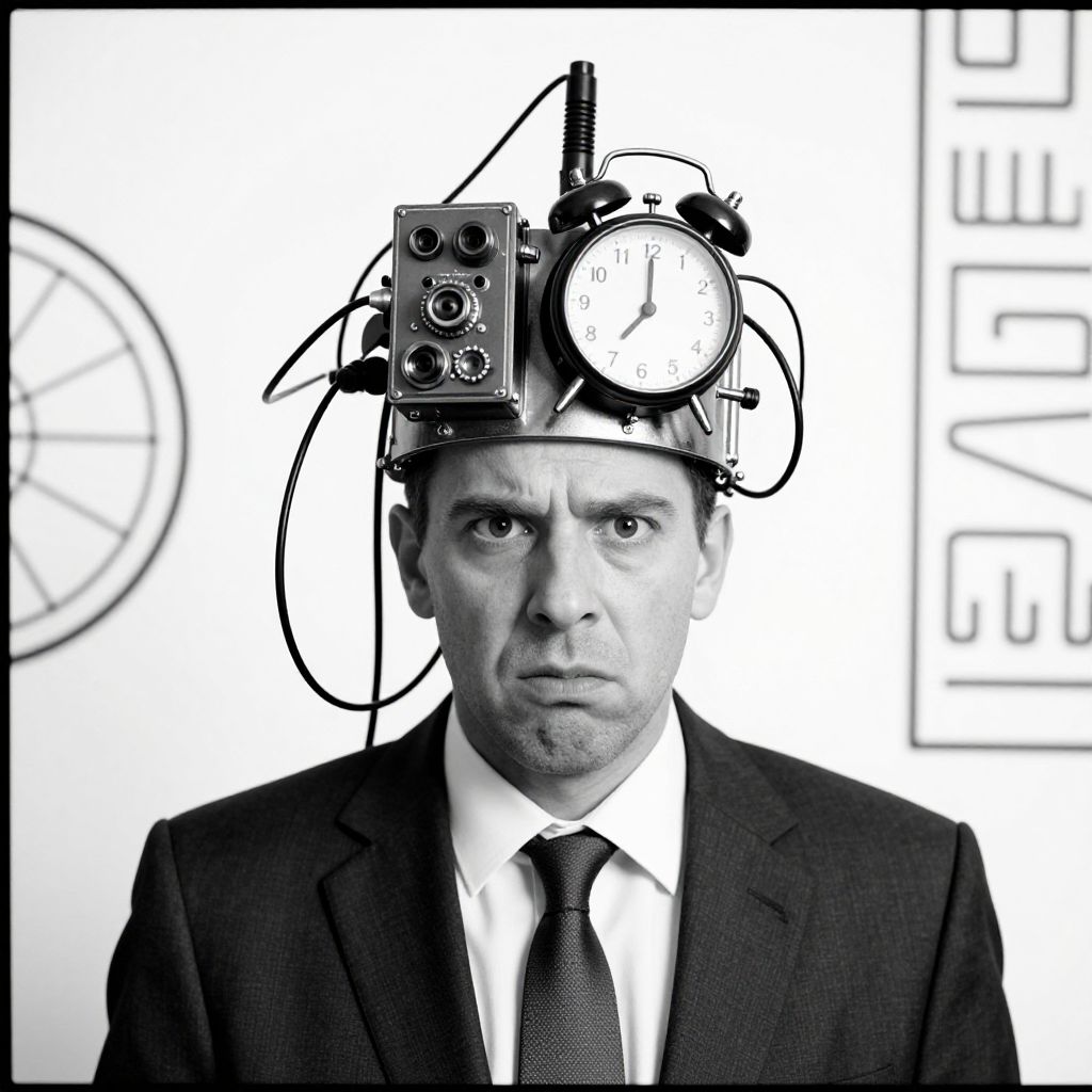 This black-and-white photograph features a serious-looking middle-aged man with short hair, wearing a dark suit, white shirt, and dark tie. He has a concerned expression and is adorned with an unusual headgear: a vintage film camera mounted on his forehead with a round clock attached to it, both connected by wires. The background is plain white with partial, out-of-focus text on the right and a circular logo on the left. The high-contrast image emphasizes the surreal and thought-provoking nature of the subject's attire and accessories, creating a striking visual.