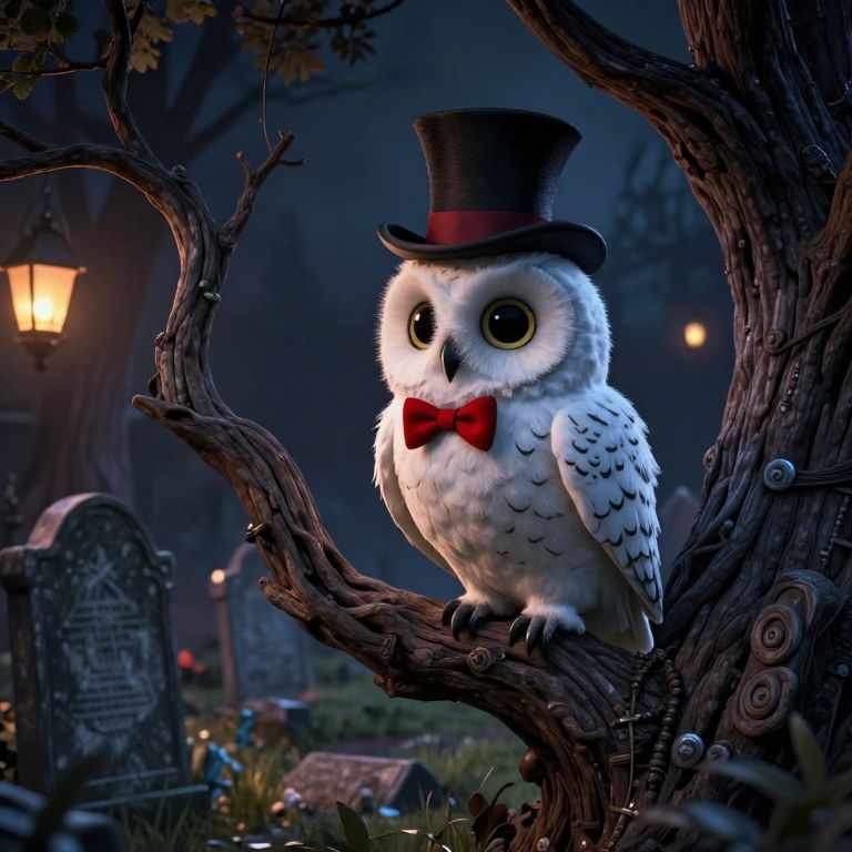 Visualize an enchanting digital artwork reminiscent of Tim Burton's distinctive blend of whimsy and eeriness, portraying a close-up view from the perspective of a curious insect observing a stately, spectral white owl resting on an age-old, gnarled tree in a nocturnal cemetery. The owl is adorned with a top hat and a minuscule red bowtie, adding an air of otherworldly allure to its presence. As the night unfurls around them, gentle light from dispersed lanterns bathes the scene in a warm, ethereal glow that dances across the weathered tombstones, emphasizing the intricate interplay between light and shadow. This captivating image conveys an emotional spectrum that interweaves wonder with enigma, as if this peculiar tableau is a gateway to a realm where time pauses and enchantment dwells within the ordinary.