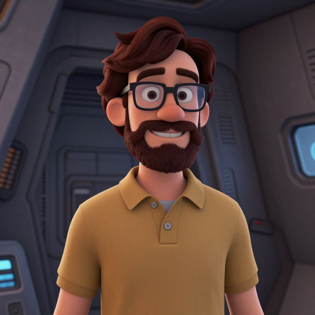 Cell shaded, welcoming, happy, husky, nerdy man character portrait, inside a borg cube, wearing polo shirt, earth tones, dark auburn wavy hair, full beard, glasses without frames, freckles, by don bluth, highly detailed, dynamic shadows, 4 k, wallpaper - 1024