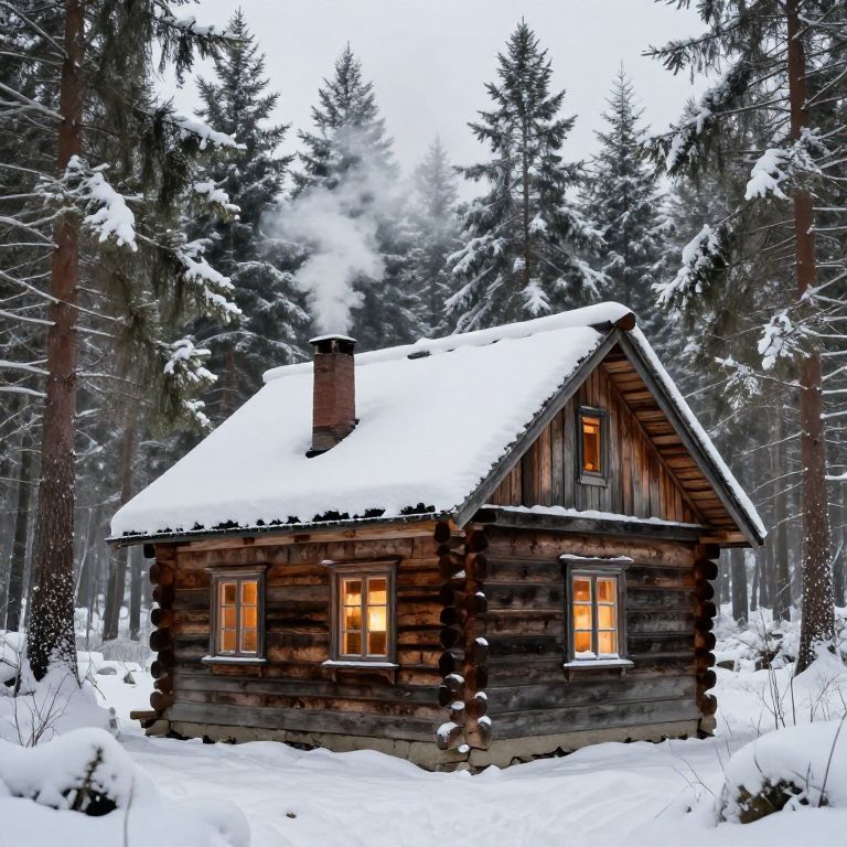 Rustic Wooden Cabin in Snowy Forest