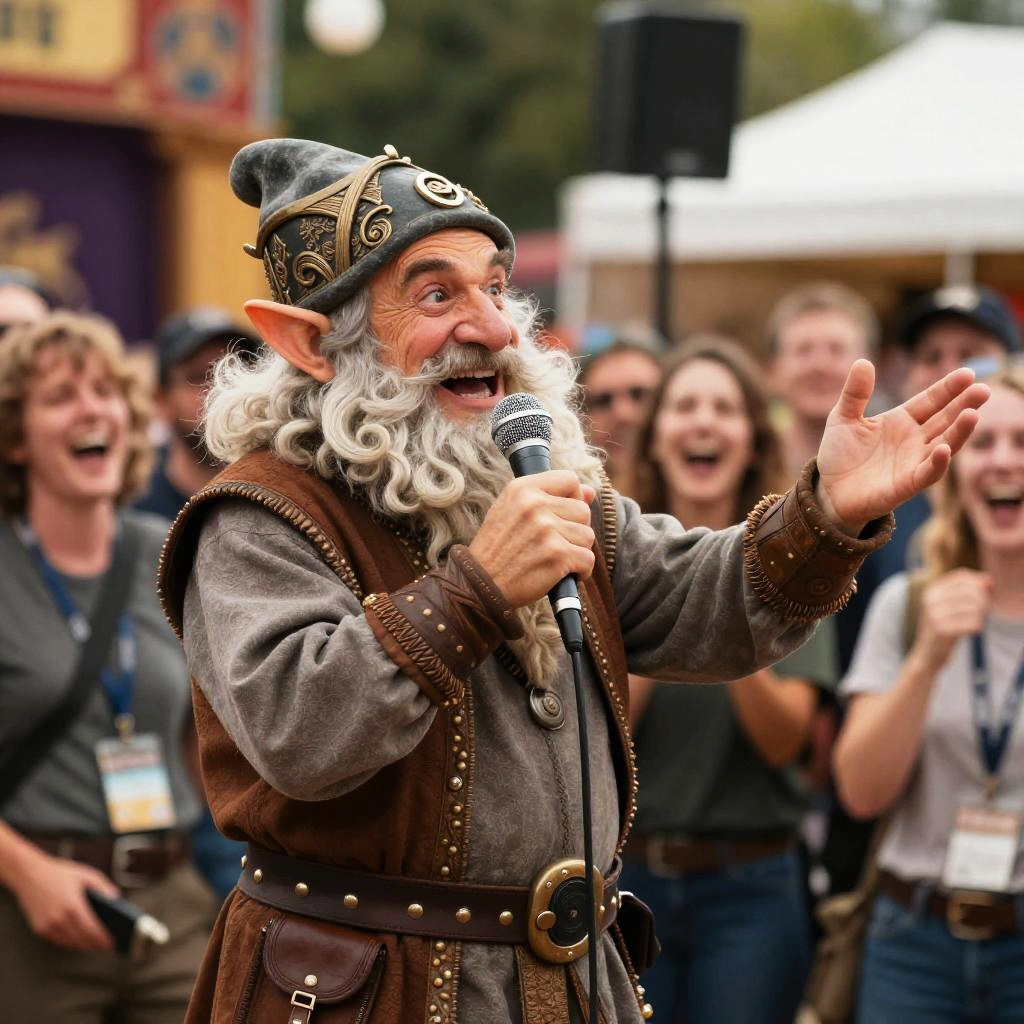 Realistic photo.D&D-style illustration of a jovial dwarf, speaking into a microphone with one hand and gesturing with an open palm to a laughing crowd. The setting is an outdoor festival comedy scene, with intricate character details and a vibrant color palette. The crowd reacts joyfully, capturing the energy and humor of the moment. realistic photo