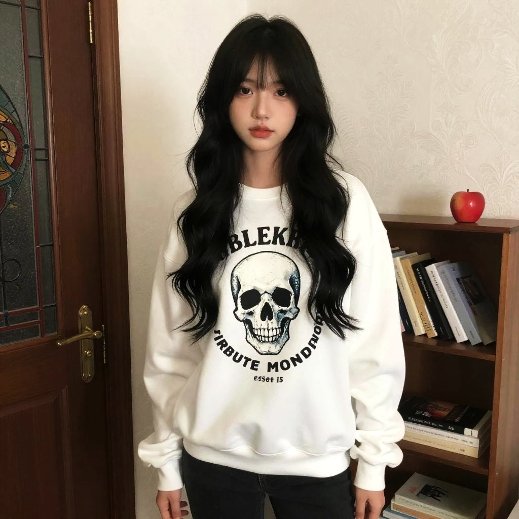 Photograph of an Asian woman with long black hair, wearing a white "Black Skull Pure Murder" sweatshirt, standing in a room with wooden door