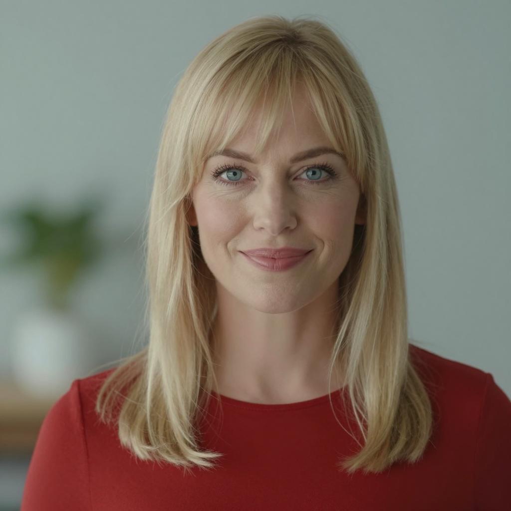Woman with short blonde hair, smiling, wearing a dark green ribbed turtleneck with a circular badge, pointing to a white sign that reads "for Treasure" in blue and yellow letters. Background includes a bulletin board with a photo and wooden desk.