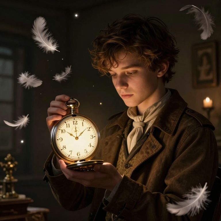 In a dimly lit room where whispers of nostalgia linger, a young time-traveler cradles a glowing pocket watch, its golden hands ticking not just seconds but the delicate balance between memory and mystery, as feathers of wonder float free, embodying the fragile dance between past and future.