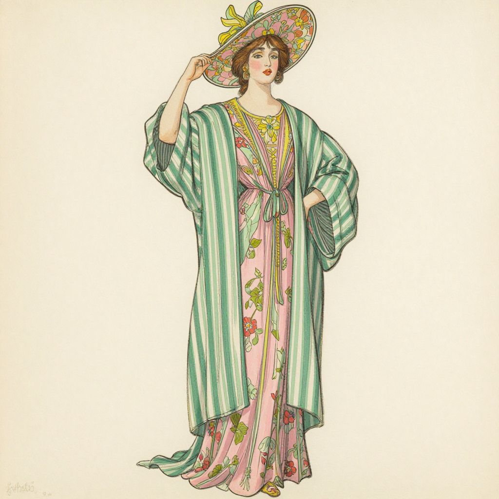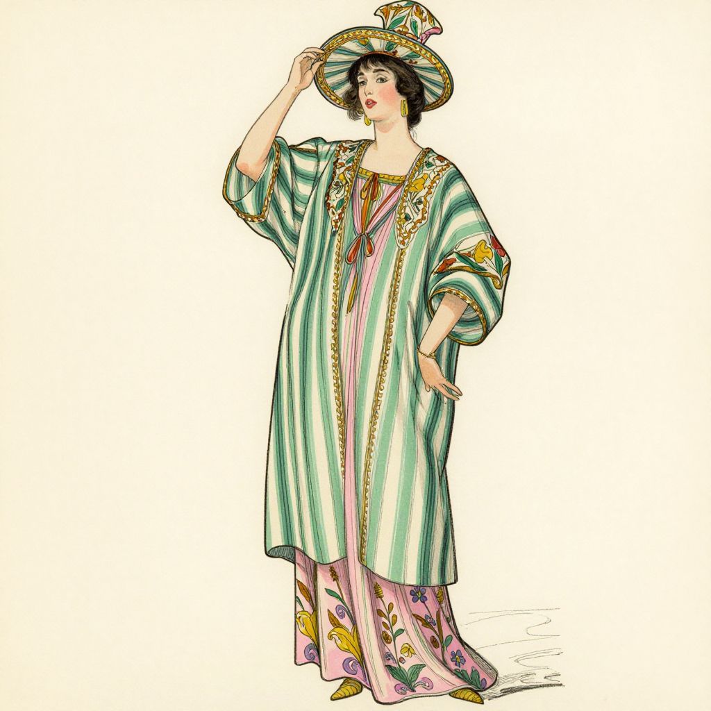 A vintage fashion illustration by Léon Bakst for Paul Poiret, 1911, showcasing a woman in a flowing, striped green robe over a pink dress, adorned with floral patterns and complemented by a matching wide-brimmed hat, rendered in a classic hand-drawn style with soft, elegant lines and pastel hues.