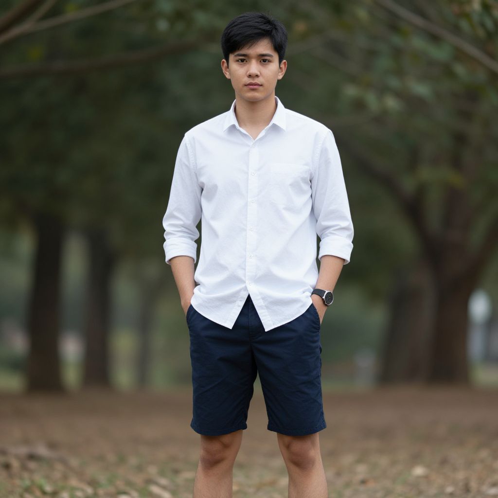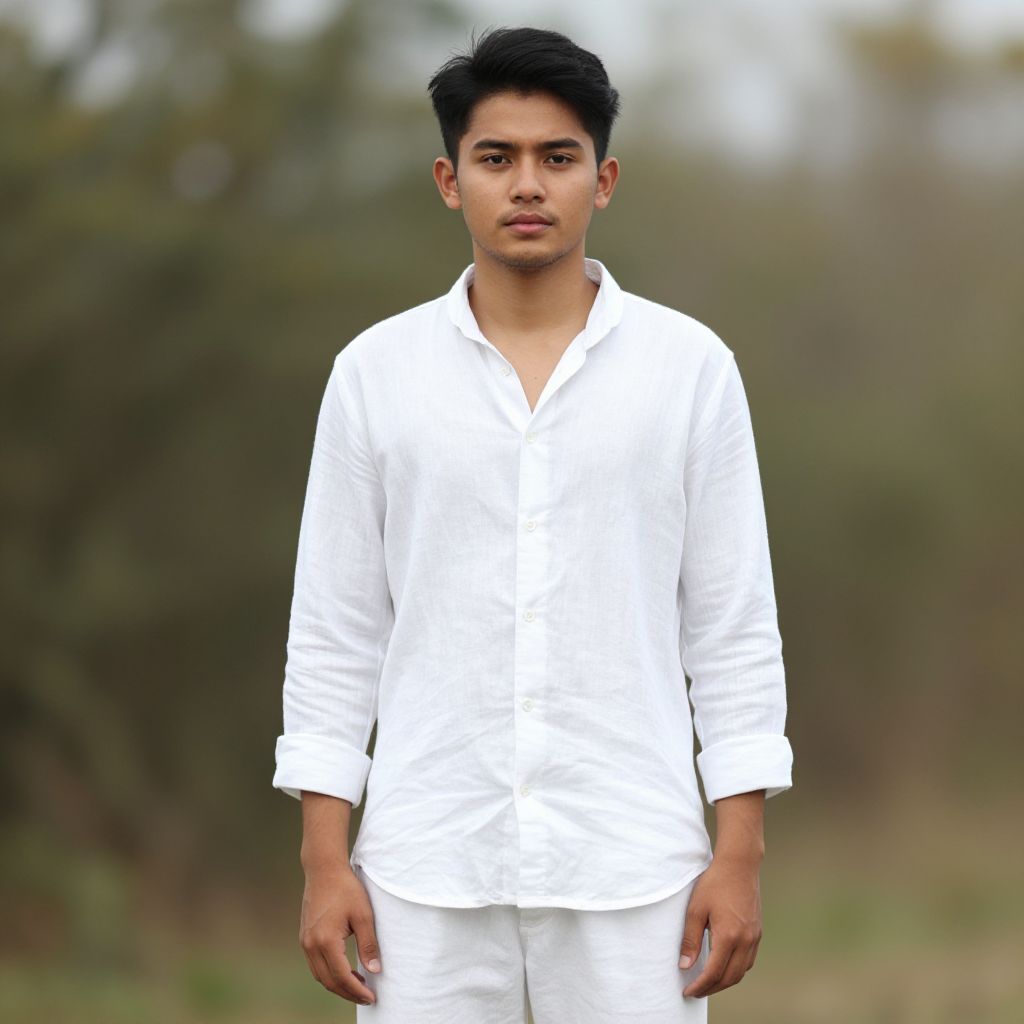 "linen outfit man, 1boy, solo, male focus, shirt, realistic, flower, white shirt, looking at viewer, white pants, pants, outdoors, blurry, black hair, blurry background, short hair, standing, facial hair, straight-on, asian Realistic photo of casual sexy person with pretty face"