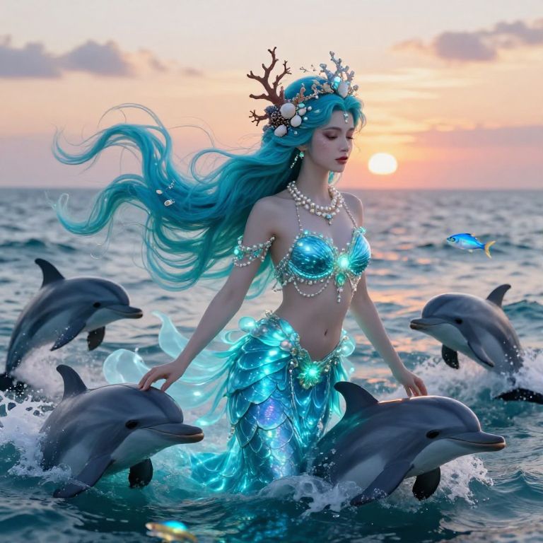 Beautiful sea goddess emerging from the ocean waves at sunset, flowing aqua-blue hair adorned with seashells and pearls, intricate coral crown, ethereal bioluminescent glow, surrounded by playful dolphins and shimmering fish, detailed fantasy art style.