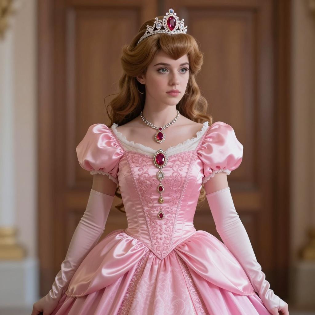 Photorealistic portrait of a fair-skinned young woman dressed as a princess with long blonde braided hair adorned with pink ribbons. She wears a shimmering light blue dress with puffed sleeves and a silver tiara featuring a large blue gem. The subject has blue eyes and a serious expression, standing outdoors in daylight with a blurred crowd background.