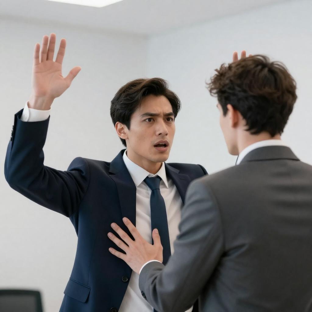 Two men in suits, intense confrontation. One man, dark hair, open mouth, right arm raised, left hand on other man's chest. Other man, brown hair, back to camera, hands raised. Indoor setting, white walls.