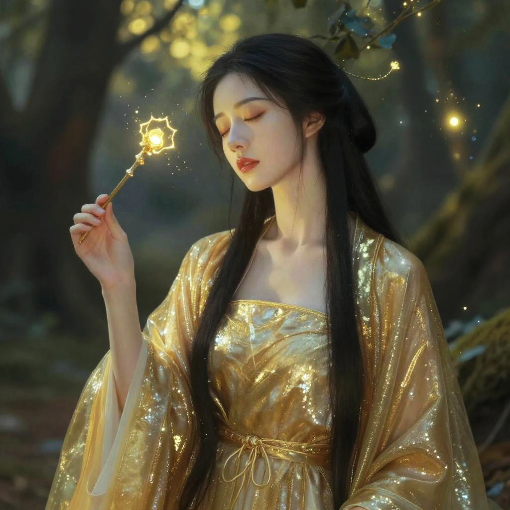 Digital painting of a serene Asian woman with long, black hair and fair skin, wearing a gold, shimmering robe. She holds a thin, delicate wand in her right hand, eyes closed, lost in thought. The background features a mystical forest with glowing, golden light filtering through the trees, creating a magical, ethereal atmosphere. Her expression is peaceful and contemplative.