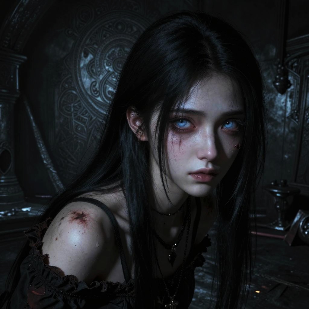 Visual impact, Ultra-realistic 8k CG, masterpiece, ((ultra-detailed background, delicate pattern, intricate details)), best quality, very detailed face, extremely detailed eyes and face, extremely detailed eyes, The pitch black basement, 1girl, beg for mercy, solo, black hair, long hair, light blue eyes, A fearful expression, Poor eyes, looking at viewer, Damaged clothes, Dynamic characters, gothic, chiaroscuro