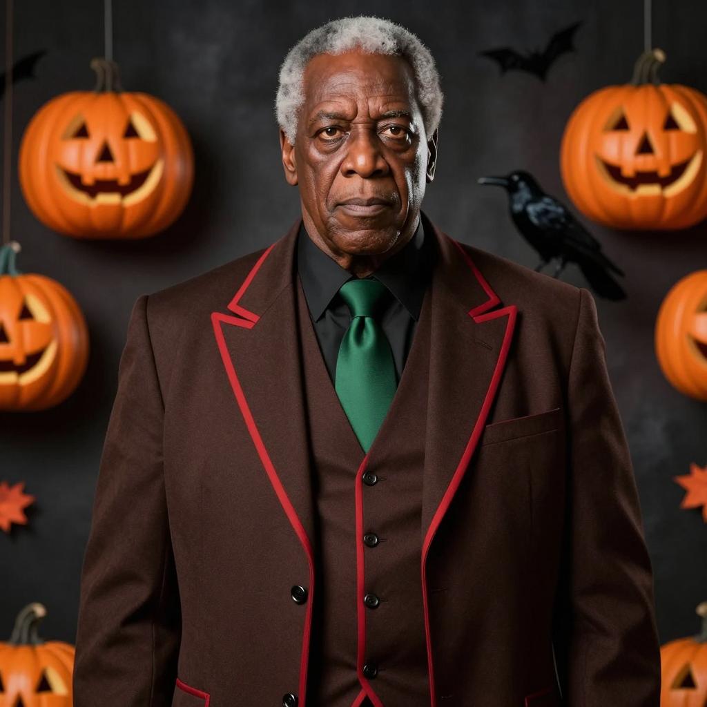 Idiom costume, photorealistic, full-body shot, middle-aged black man, short black hair, wearing tan prison jumpsuit, white sneakers, standing in grand hallway, marble floor, dark wooden doors, tall white columns, sunlight from left, serious expression, hands in pockets, realistic lighting, modern, cinematic style, realistic ures, neutral colors, slight shadowing, no background objects, symmetrical composition
