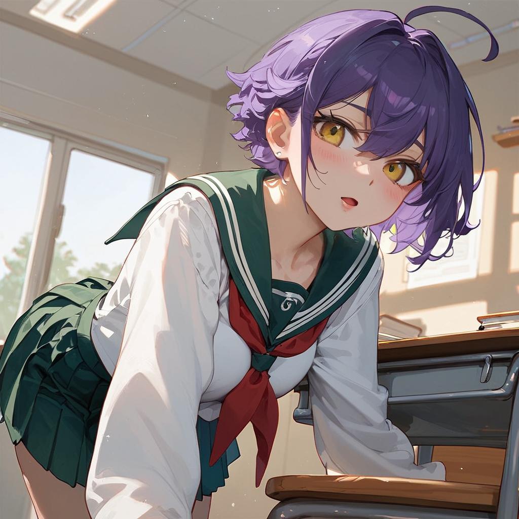 Score_9, score_8_up, score_7_up, source_anime, utenahiiragi, short hair, yellow eyes, purple hair, ahoge, hair intakes, skirt, shirt, long sleeves, school uniform, white shirt, pleated skirt, serafuku, sailor collar, neckerchief, green skirt, green sailor collar, indoors, classroom, bent over, looking at viewer, dutch angle, cowboy shot