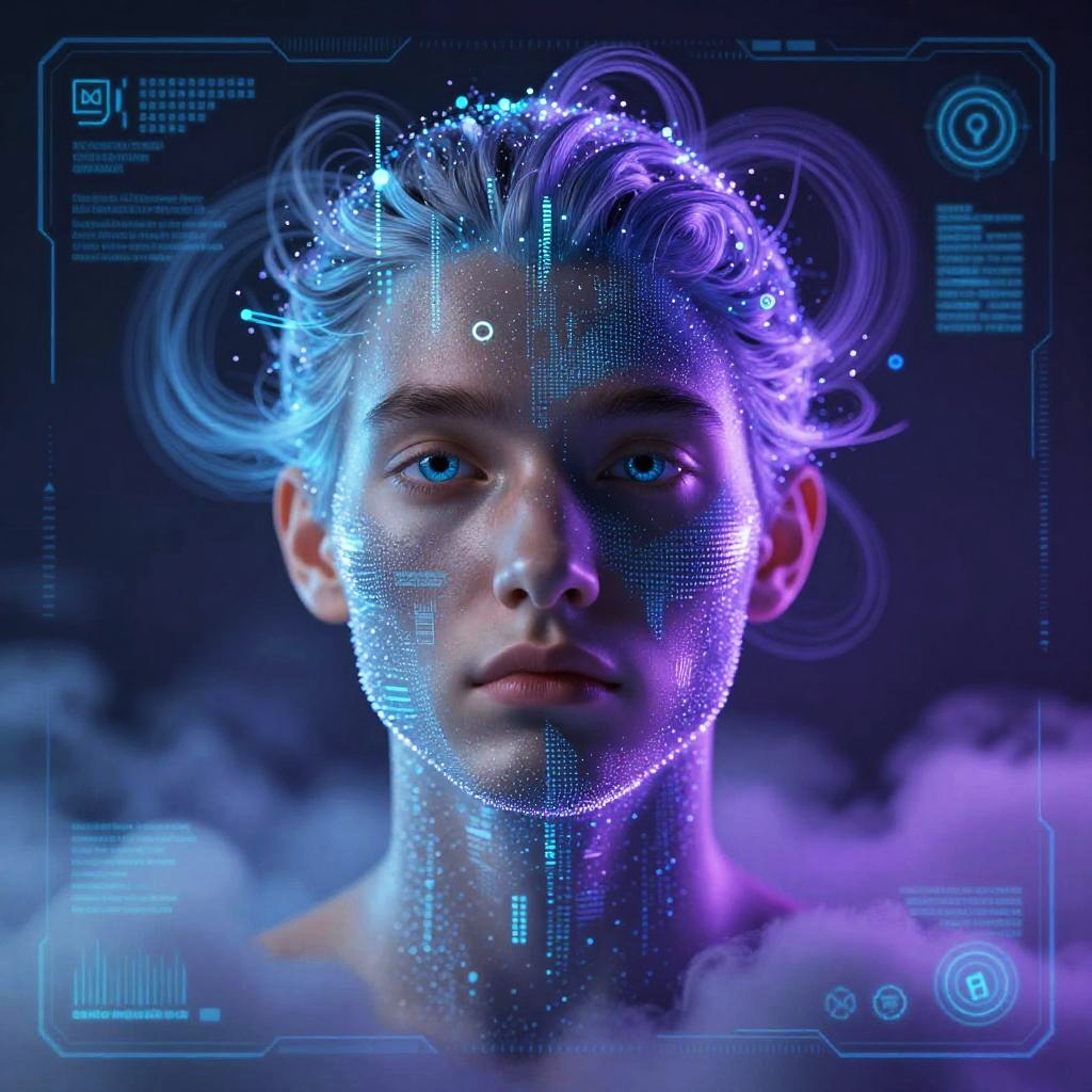 CGI portrait of a young man with short brown hair, blue eyes, and fair skin, wearing a white shirt, in a futuristic, blue-l