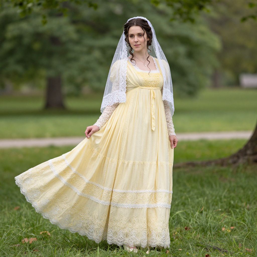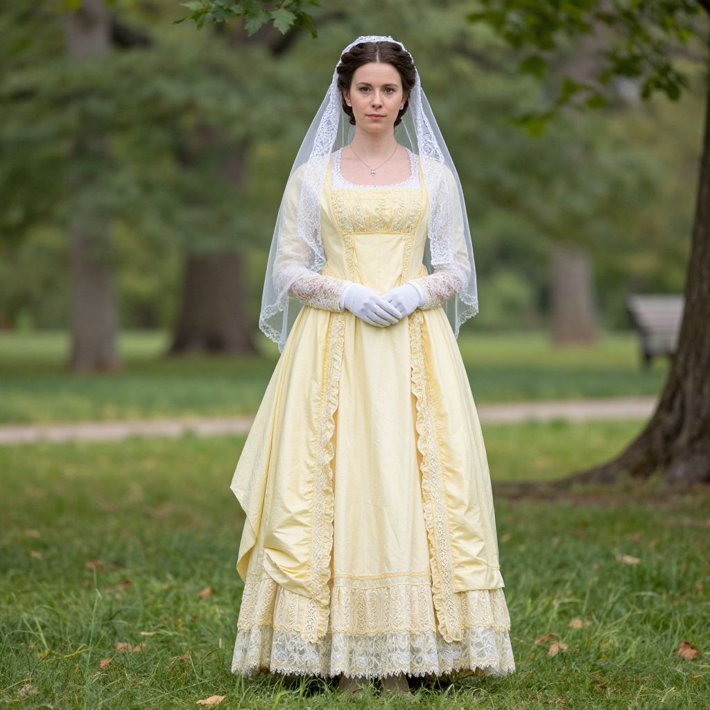 Woman wearing a pristine Civil War-era dress costume reenactment, featuring a flowing yellow gown with intricate lace detailing and a delicate veil, stands gracefully against a lush green park backdrop, evoking the elegance reminiscent of \"North and South.\