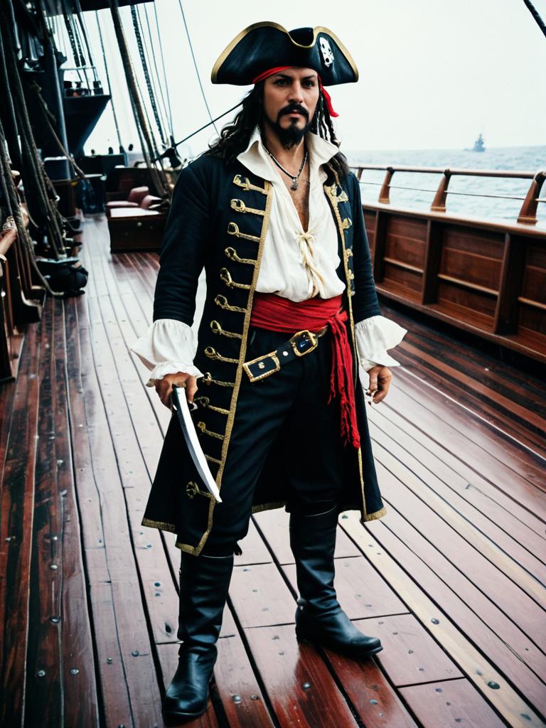Man in Pirate Costume, full-body cosplay photo on ship deck setting