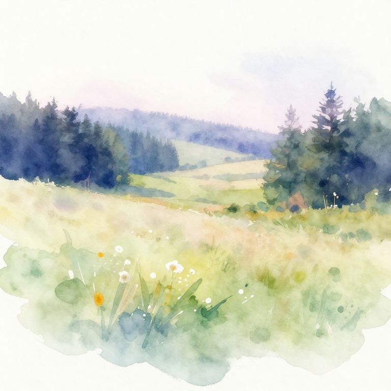 Watercolor painting of a sunlit meadow with soft yellow flowers, bordered by dark green pine trees under a pale blue sky.