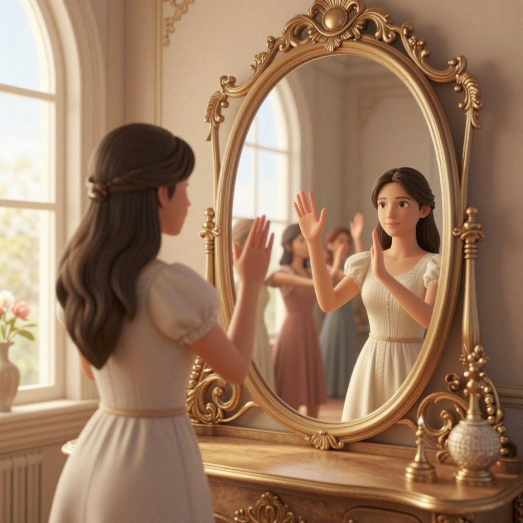 Digital artwork of a young woman with long, dark hair, wearing a white dress, admiring herself in an ornate, gold-framed mirror in