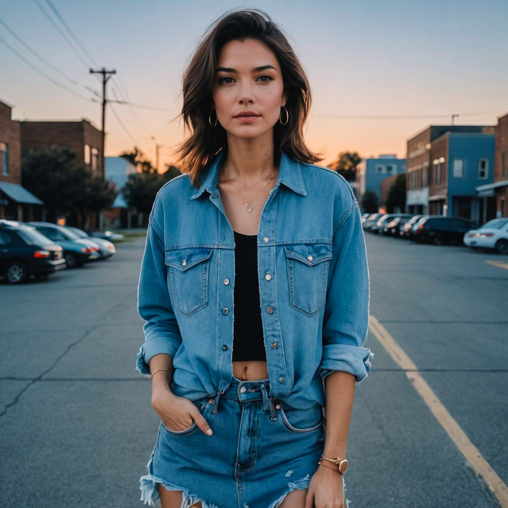 Photo of a Diamond shaped woman, Long Shag, denim outfit, Denim shirt with a black tank top and denim skirt, medium wash denim, soft lighting and pastel colors
