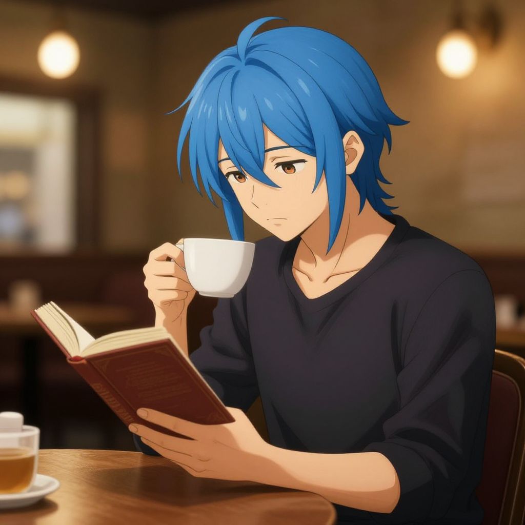 Anime man with blue hair sitting at a vintage cafe, reading a book with a cup of tea, cozy atmosphere with warm lighting, detailed character features like a subtle scar and unique hairstyle, soft bokeh effects in the background to create depth