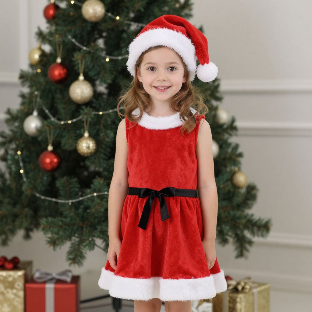 Girl Christmas Costume, little girl in a red dress and santa hat standing in front of a christmas tree