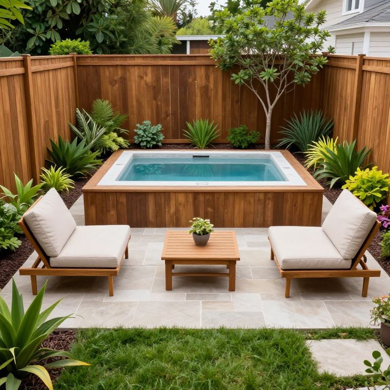 Photograph of a serene garden featuring a small, circular, stone-edged pond with gently rippling water and a central fountain. Surrounding the pond are lush green grass, vibrant pink and yellow flowers, and large, weathered rocks. Pathway stones lead around the pond, bordered by various plants and shrubs. In the background, a wooden fence encloses the garden, adding a sense of privacy. The natural light enhances the vivid colors and textures, creating a peaceful, inviting atmosphere.