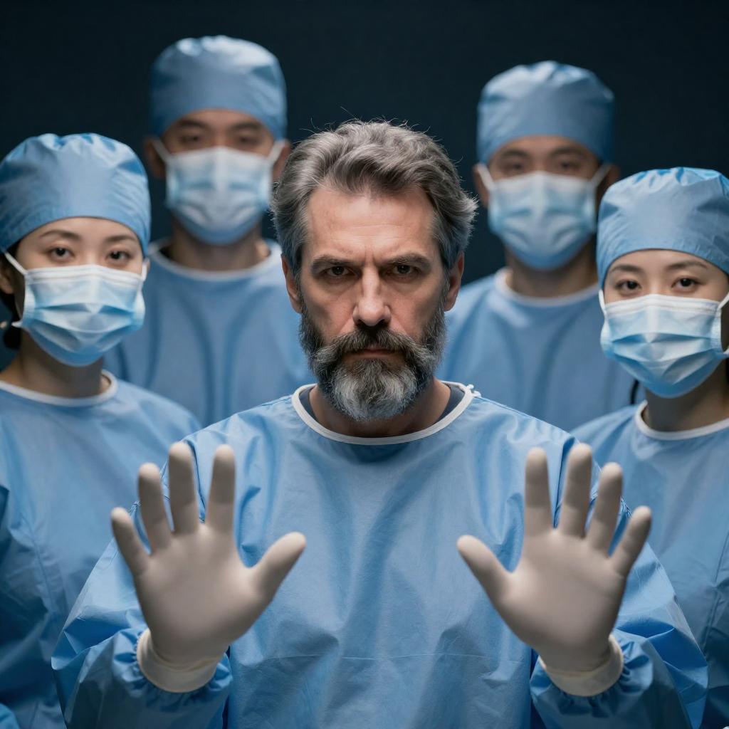 Photograph of a bearded, middle-aged man with gray hair in a blue shirt, surrounded by four masked individuals in blue surgical gowns and gloves. The man's intense gaze is directed forward, with two outstretched hands in the foreground. The background is dark, emphasizing the man's face and the masked figures behind him.