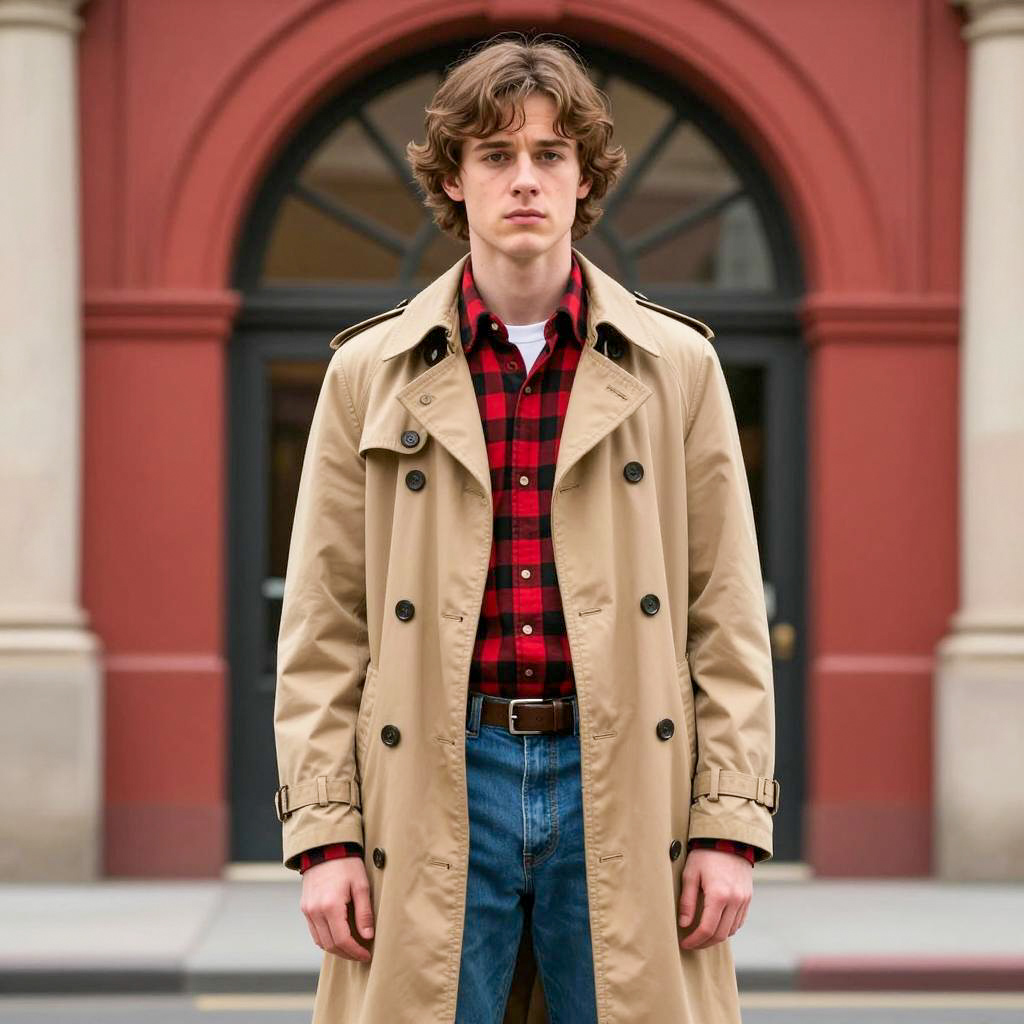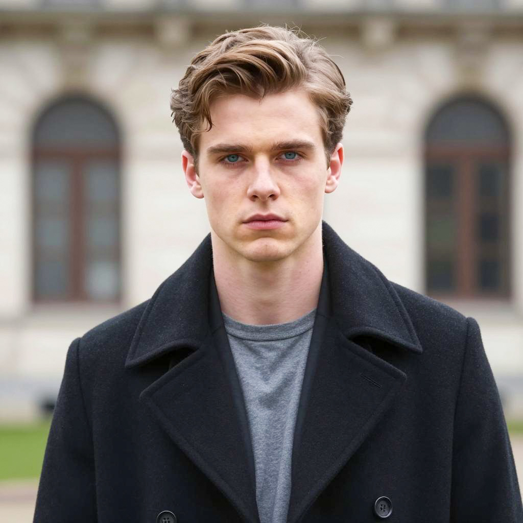 Portrait of a young Caucasian man with short light brown hair and blue eyes, wearing a maroon polo shirt. He stands in front of a large stone building with classical architecture, including wide steps and tall stone columns. In the background, four people are visible: a woman with dark hair wearing a black coat, a man in a gray suit, and two others dressed in brown coats, one wearing a hat. The setting appears to be a formal or institutional outdoor location, possibly a courthouse or university.