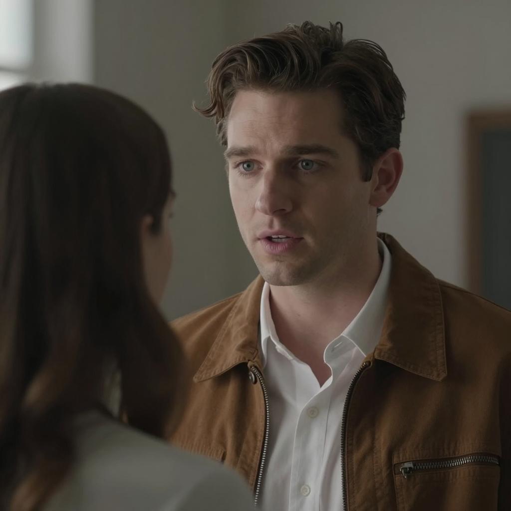 Man with short, light brown hair, blue eyes, wearing a maroon polo shirt, stands in front of a large stone building. Four people in the background: one woman with dark hair in a black coat on stairs, another man in gray suit standing on stairs, one person with brown coat on right, and another person with brown coat and hat on far right. Stone columns and wide steps in background.