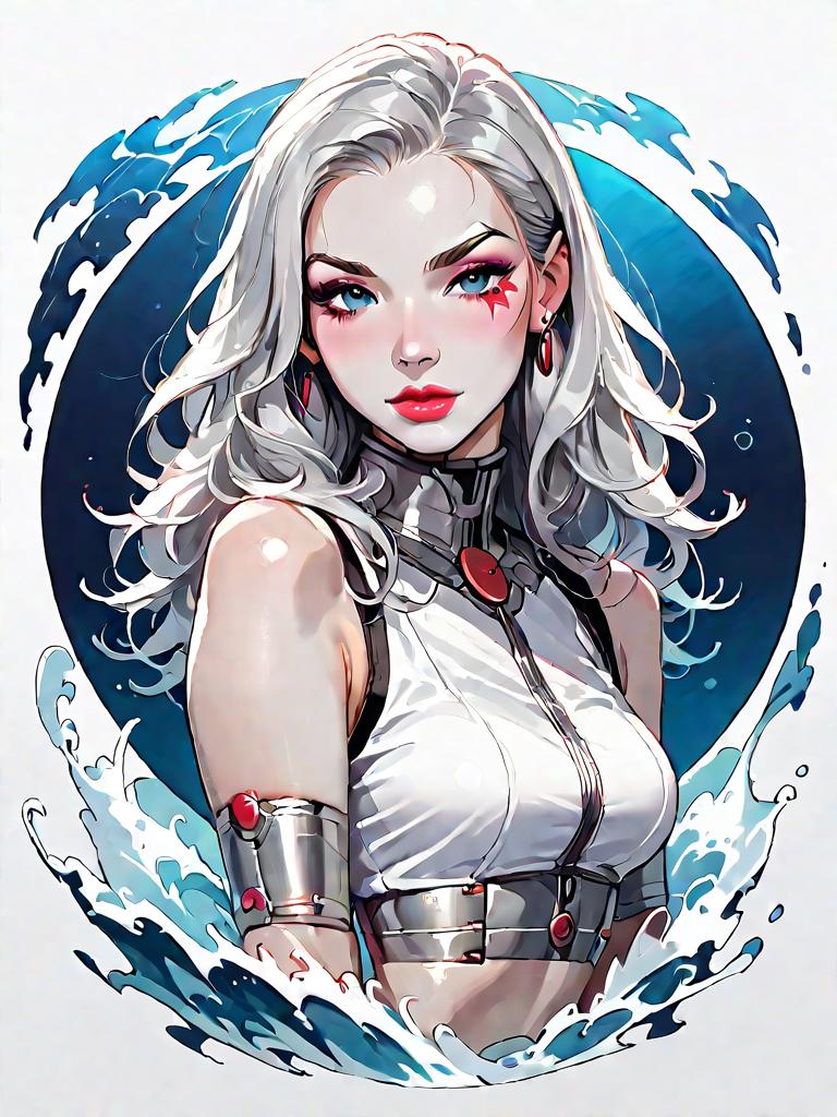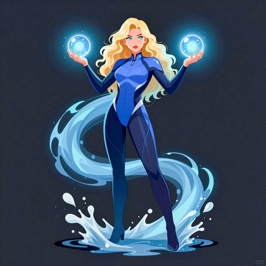 Illustration of a blonde woman with wavy hair wearing a tight blue and black bodysuit. She holds glowing blue orbs in both hands while standing on a black base with water splashing around her feet. A blue energy tail wraps around her body, set against a dark background. Her expression is focused and determined.
