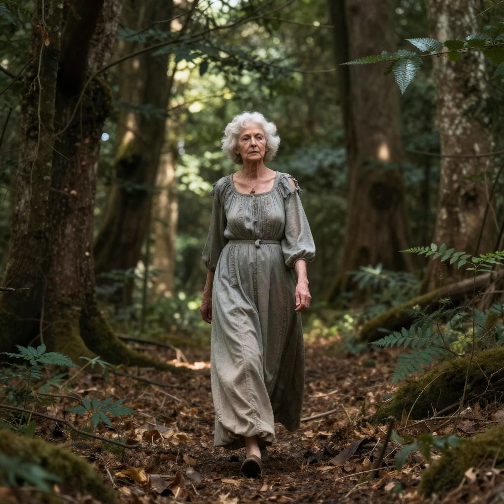 Old Missy Cooper walking through an ancient forest, wearing a long flowing dress, serene expression, dappled sunlight through trees, mystical and calm mood, highly detailed