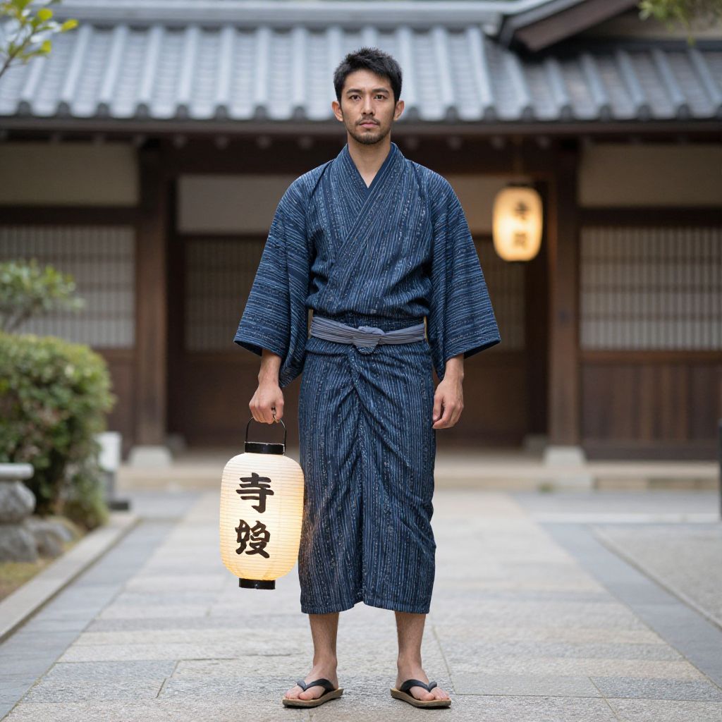 Male wearing a kimono with a red belt and brown shoes. He is standing on a street with buildings in the background.