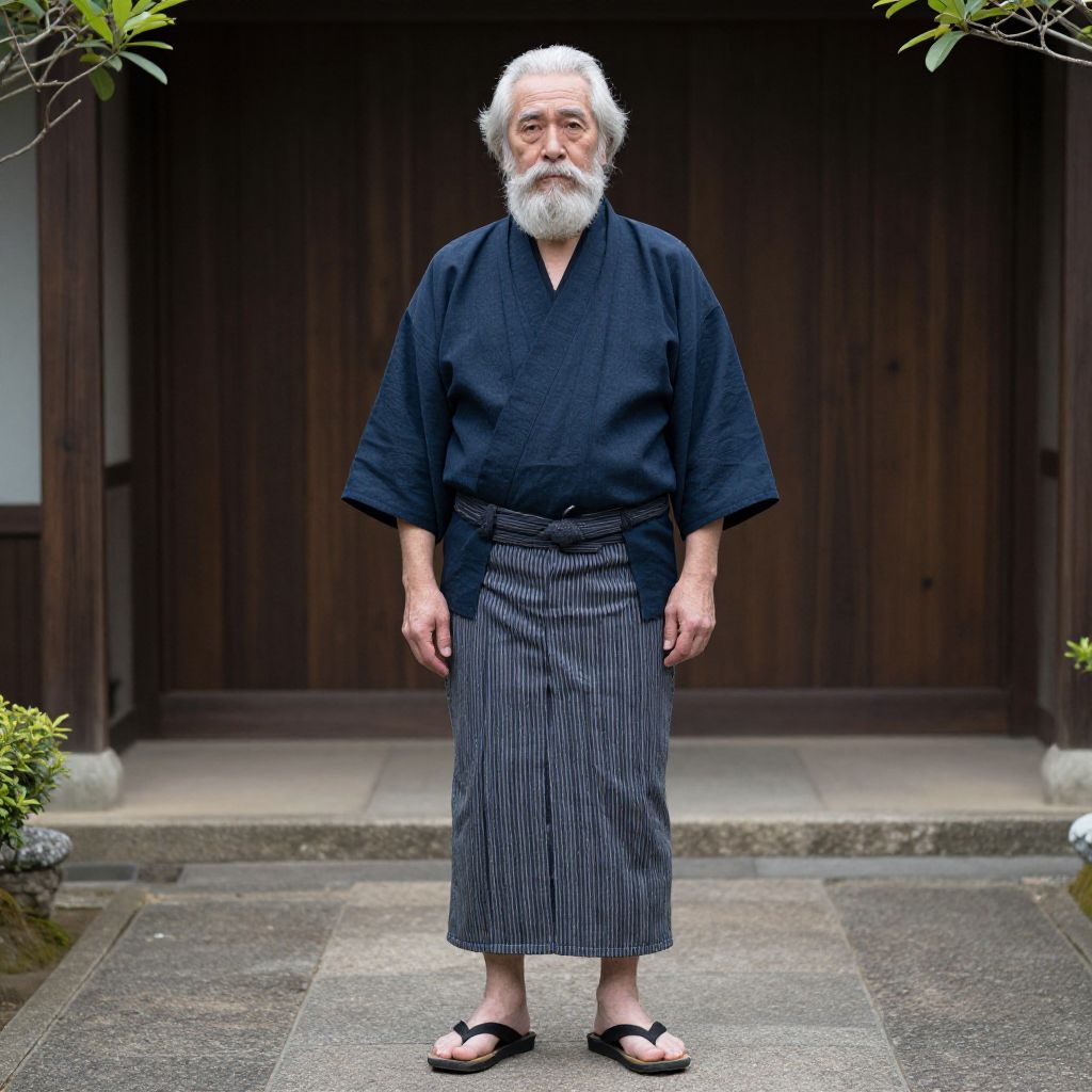Photograph of a serious, bearded Asian man in a black pinstripe kimono with a red obi, white socks, and white get