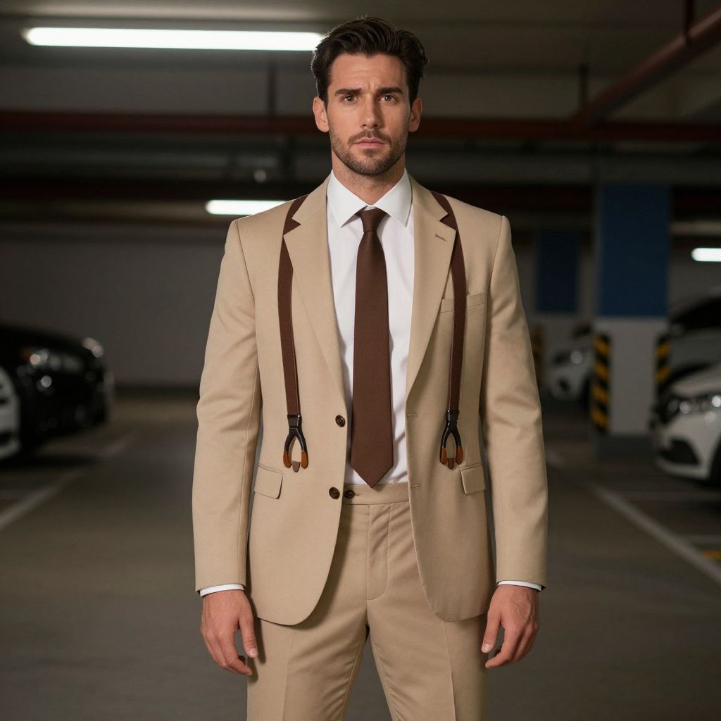 Photograph of a handsome, bearded man standing in a dimly lit underground parking garage. He has short, dark, slightly wavy hair and a serious expression. He is wearing a beige suit with brown suspenders, a white dress shirt, and a brown tie. The suit jacket is tailored and fits well, emphasizing his fit physique. The background shows blurred parking spaces with cars, including a black car on the left and a white car on the right. The ceiling has fluorescent lights, and the walls have industrial elements like pipes and columns. The overall style is modern and formal.