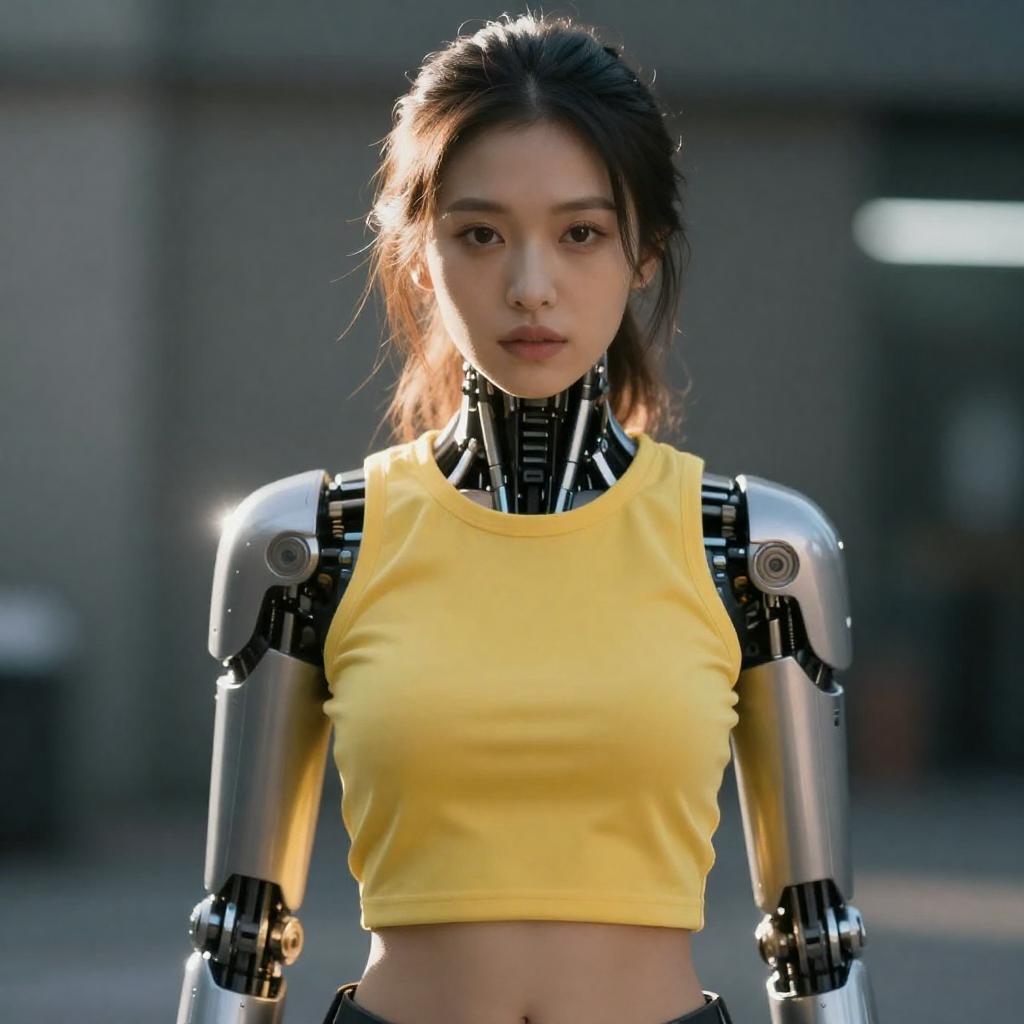 High-resolution image of a realistic female cyborg featuring a mix of human and robotic elements. The subject has an Asian appearance with a natural face and mechanical arms and neck. She is wearing a yellow crop top, standing outdoors under soft cinematic lighting and bloom effects, looking directly at the viewer with a neutral expression.
