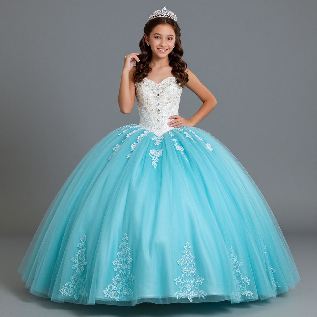 Photograph of a young girl standing against a plain gray background. She has long, wavy black hair and is wearing a white, lace-embellished, strapless ball gown with a voluminous light blue tulle skirt adorned with white lace patterns. She also wears a silver tiara with small, sparkling jewels. The girl is smiling and has one hand resting on her hip while the other lightly touches her tiara. Her complexion is light brown, and she has a slender build. The overall style is elegant and princess-like.