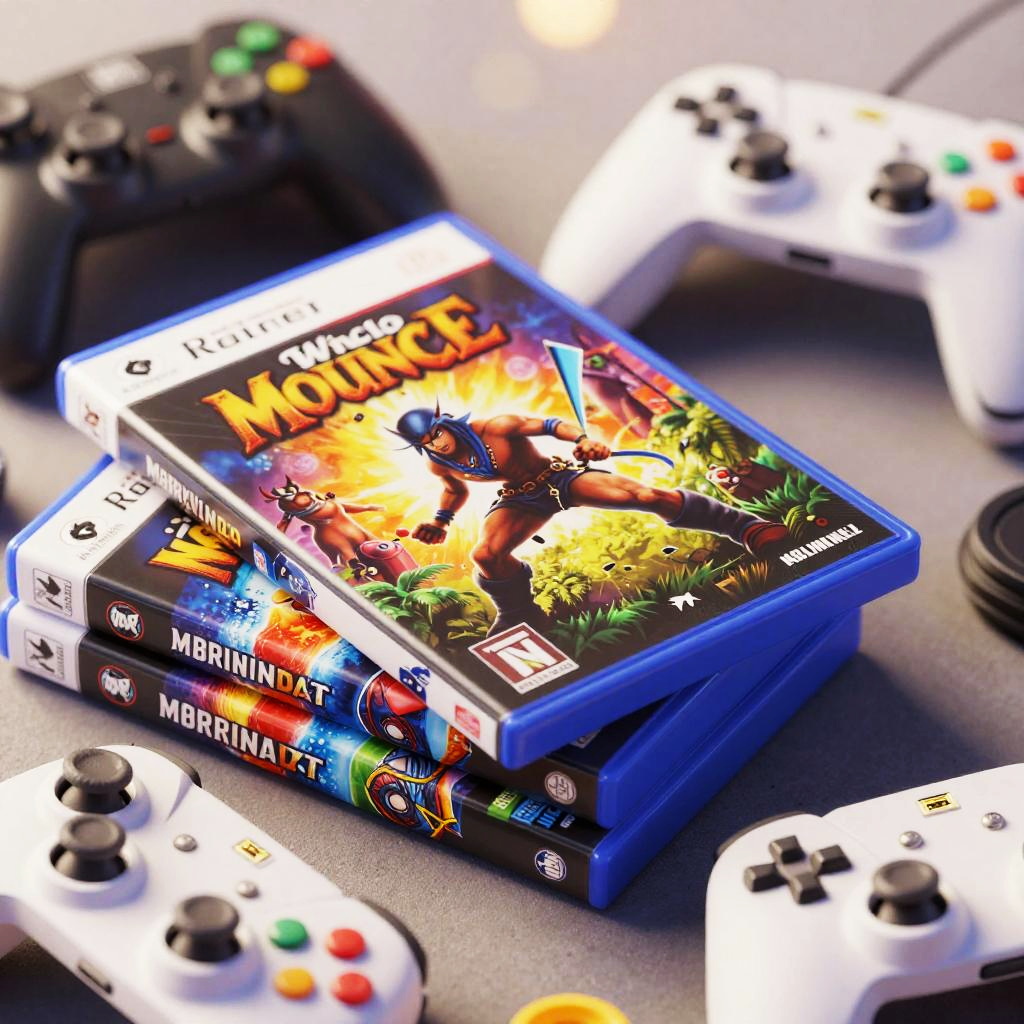 Close-up image of a stack of vibrant video game cases featuring colorful cover art, surrounded by multiple gaming controllers in black and white. The image showcases classic-style controllers with colorful buttons, set against a soft bokeh background with warm lighting that highlights the glossy game cases. The digital art style emphasizes ultra-realistic details and depth.