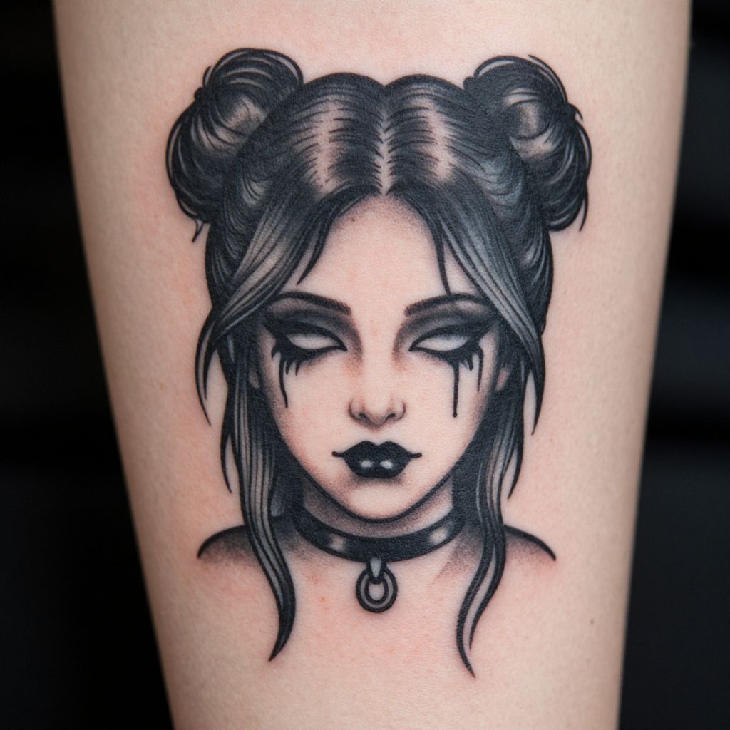 Black and gray tattoo of a woman with double buns, heavy eyeliner, nose piercing, choker, and dark lipstick on an arm.