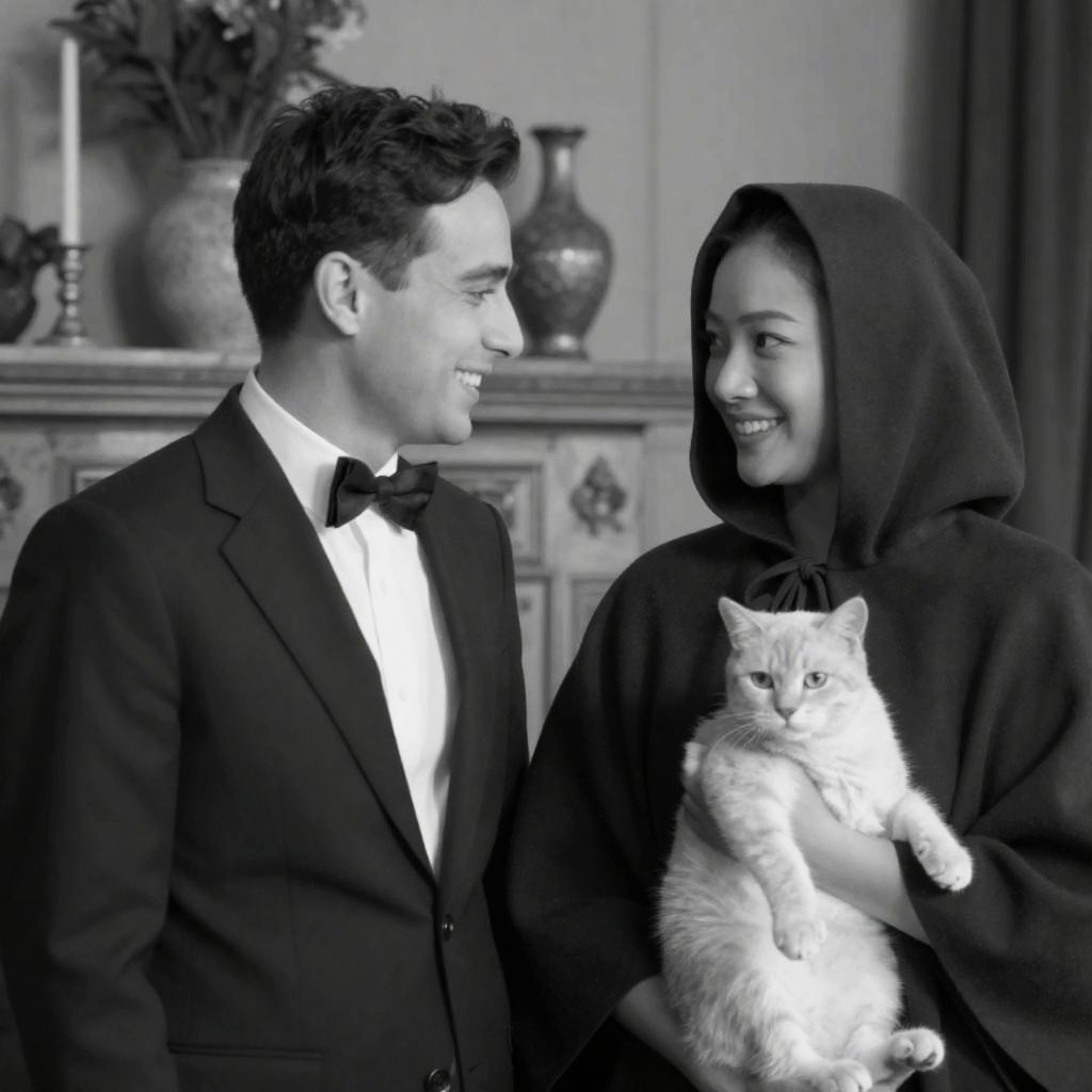 Black-and-white photograph of a man and woman in a library. The man in a dark suit and bow tie stands to the left, looking at the woman. She has dark hair in an updo, wears a light dress with puffed shoulders and a necklace, pointing with her right hand. Bookshelves and a statue in the background. The woman smiles slightly, and the man has a neutral expression. Both have fair skin.