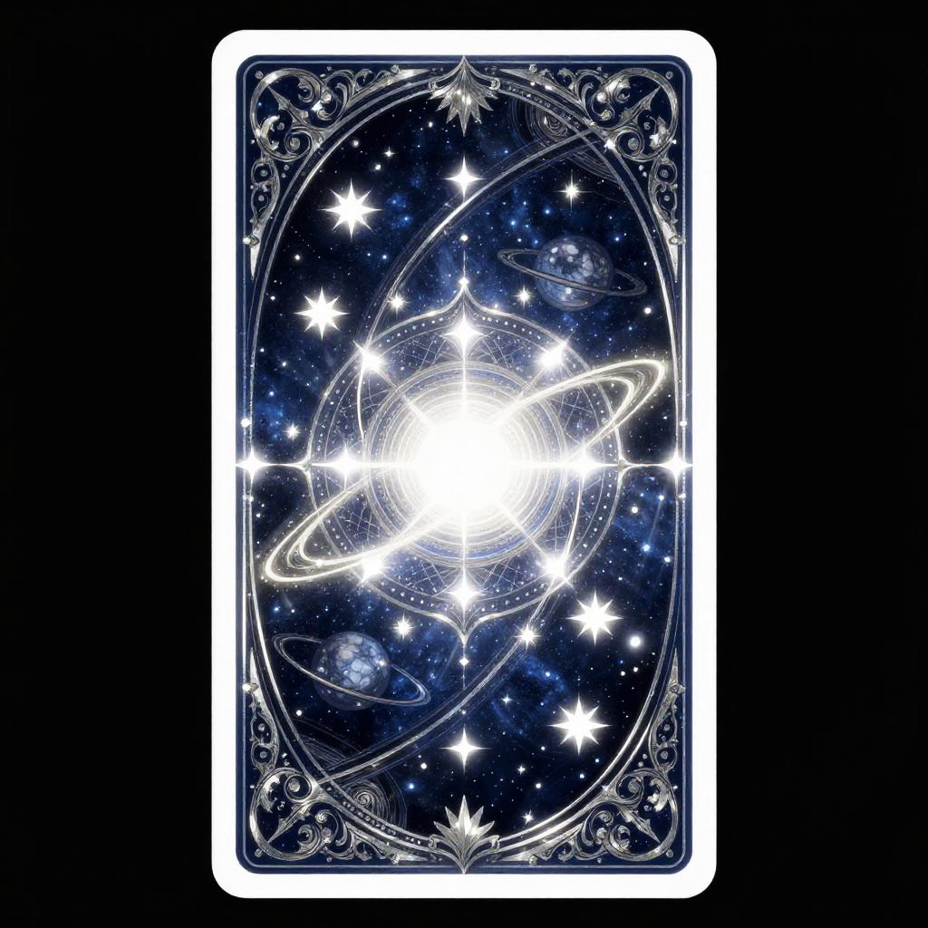 Tarot card back design celestial theme, stars and planets intertwined with ornate swirls, midnight blue and silver color palette, fantasy art style, luminous glow