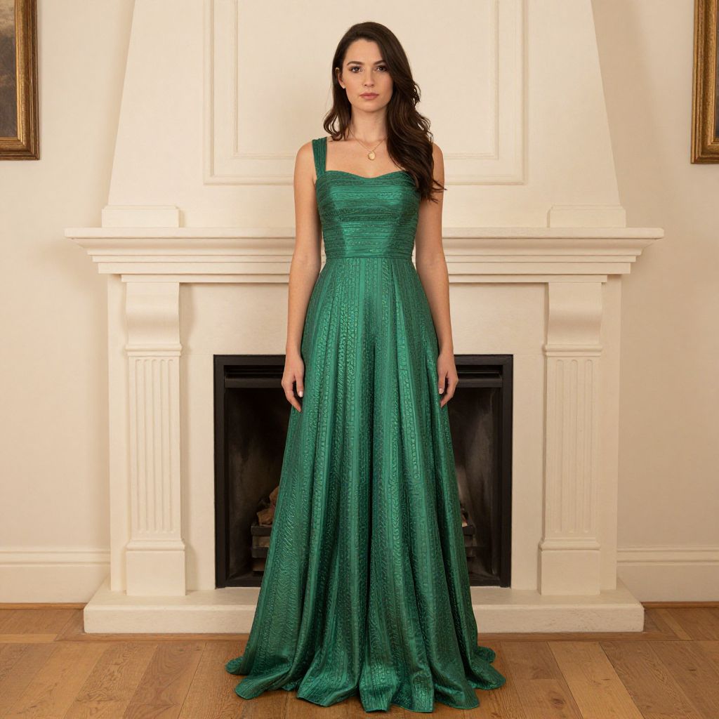 Photograph of a brunette woman in a floor-length, emerald green, textured gown, standing in front of a white fireplace.