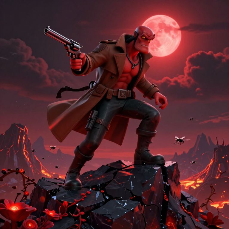 Art style: Fortnite, 3D, Action shot, Dynamic pose, Character: Hellboy in a dynamic 3/4 view, standing, crouched slightly, holding an old four-round revolver, Outfit: Long brown trench coat, Utility belt with pouches, black cargo pants, Black leather boots, yellow eyes, Scene: Hellboy stands atop a towering mountain of cracked obsidian, Lighting: Black clouds, A glowing red full moon, red sky, casting a strong red light, creating deep shadows across Hellboy and the obsidian below, Background: The horizon features volcanic terrain with glowing lava, Swarms of mosquitoes flying around the obsidian, Glowing lava flowers and red-hued flora, vines are scattered around the landscape, Windy