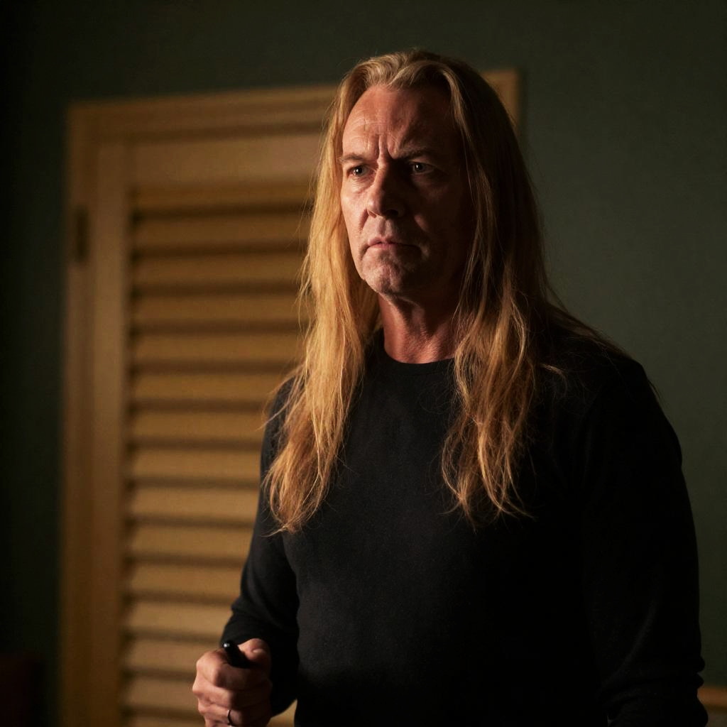 Middle-aged man with long, dirty blonde hair, intense expression, pointing a gun directly at the camera. Wearing a gray shirt, sunlight from the right side. Background has a blurred, beige wall and a metal chair. One person. Close-up shot.