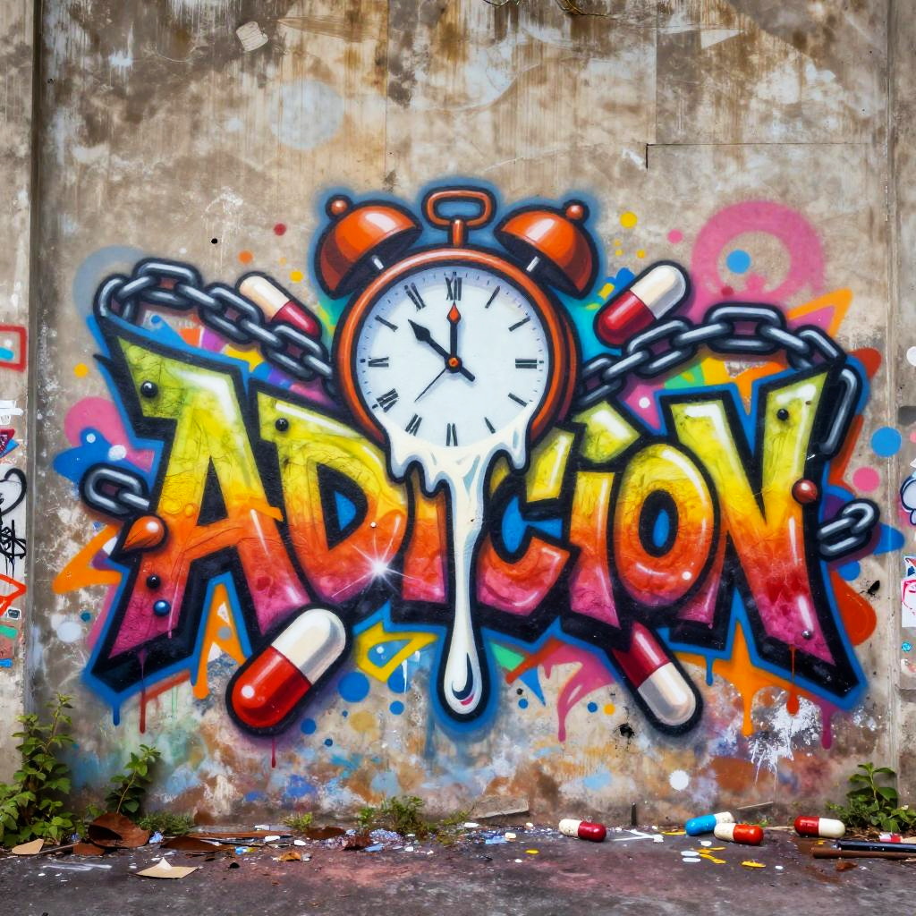 Symbol for addiction, vibrant graffiti-style street art with melting clocks, pills, and chains intertwined, colorful chaotic composition, urban decay background, raw artistic expression