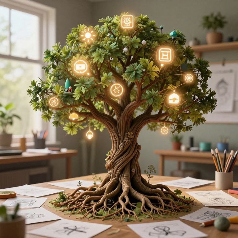 Concept art ideas generator represented by an organic tree of imagination with branches sprouting glowing icons and miniature scenes, roots in a vibrant creative studio filled with scattered sketches, warm natural light filtering through windows, highly detailed