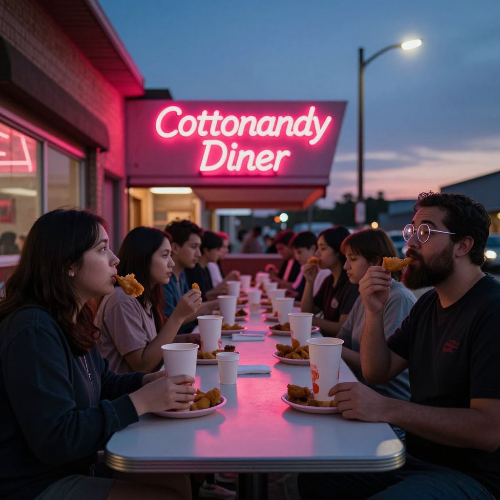 A bustling neon-lit diner in a small midwestern town at dusk, with a long rectangular table in the center filled with diners holding paper cups and eating fried foods, a man with a beard and round glasses looks up from his plate, the neon sign 'Cotton Candy Diner' glowing in a deep magenta with a shadowy streetlight behind it.